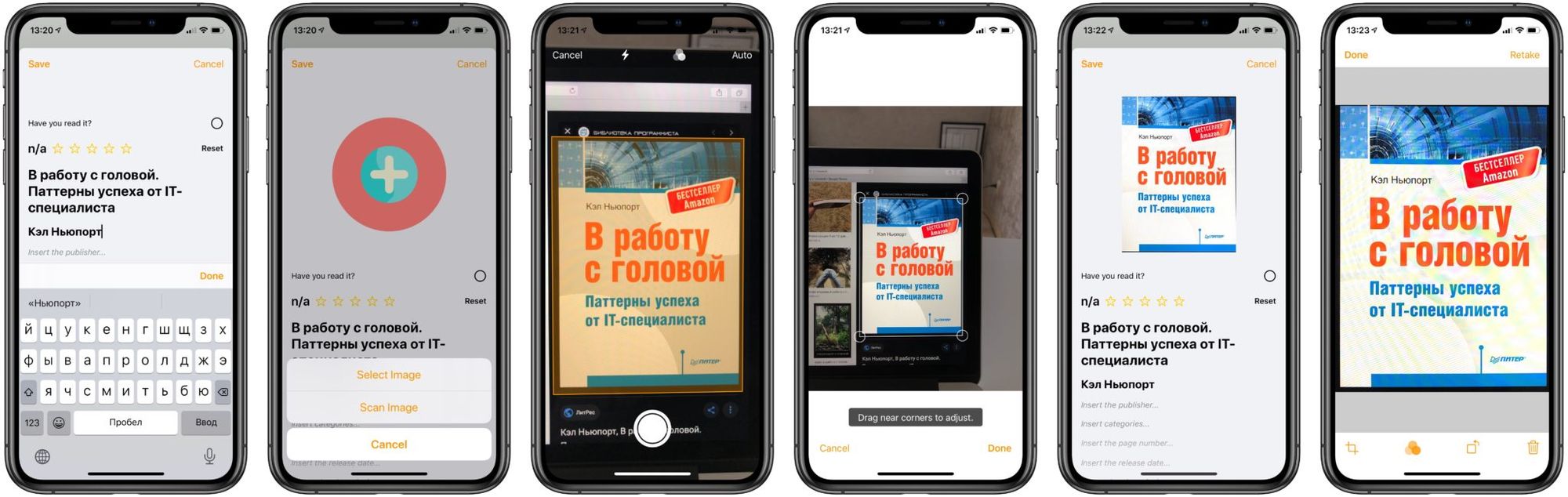 Если поиск в Сети не принёс необходимых результатов, то название книги или фамилию автора можно ввести вручную. Есть возможность отыскать книгу, разместив её изображение. Фото можно сделать, например, с экрана компьютера. Его можно отредактировать — обрезать, повернуть и т.д.