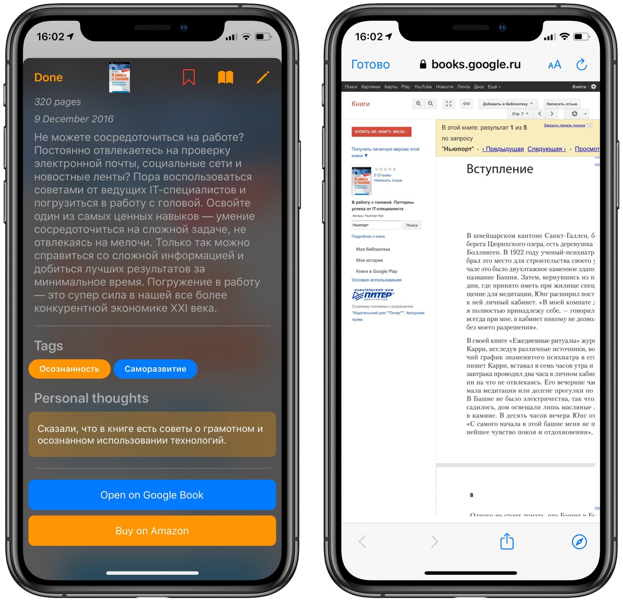 При добавлении произведения (или в процессе редактирования информации) можно открыть его в Google Книгах непосредственно из приложения и прочитать его содержание или ознакомиться с главами, которые представлены в открытом доступе.
