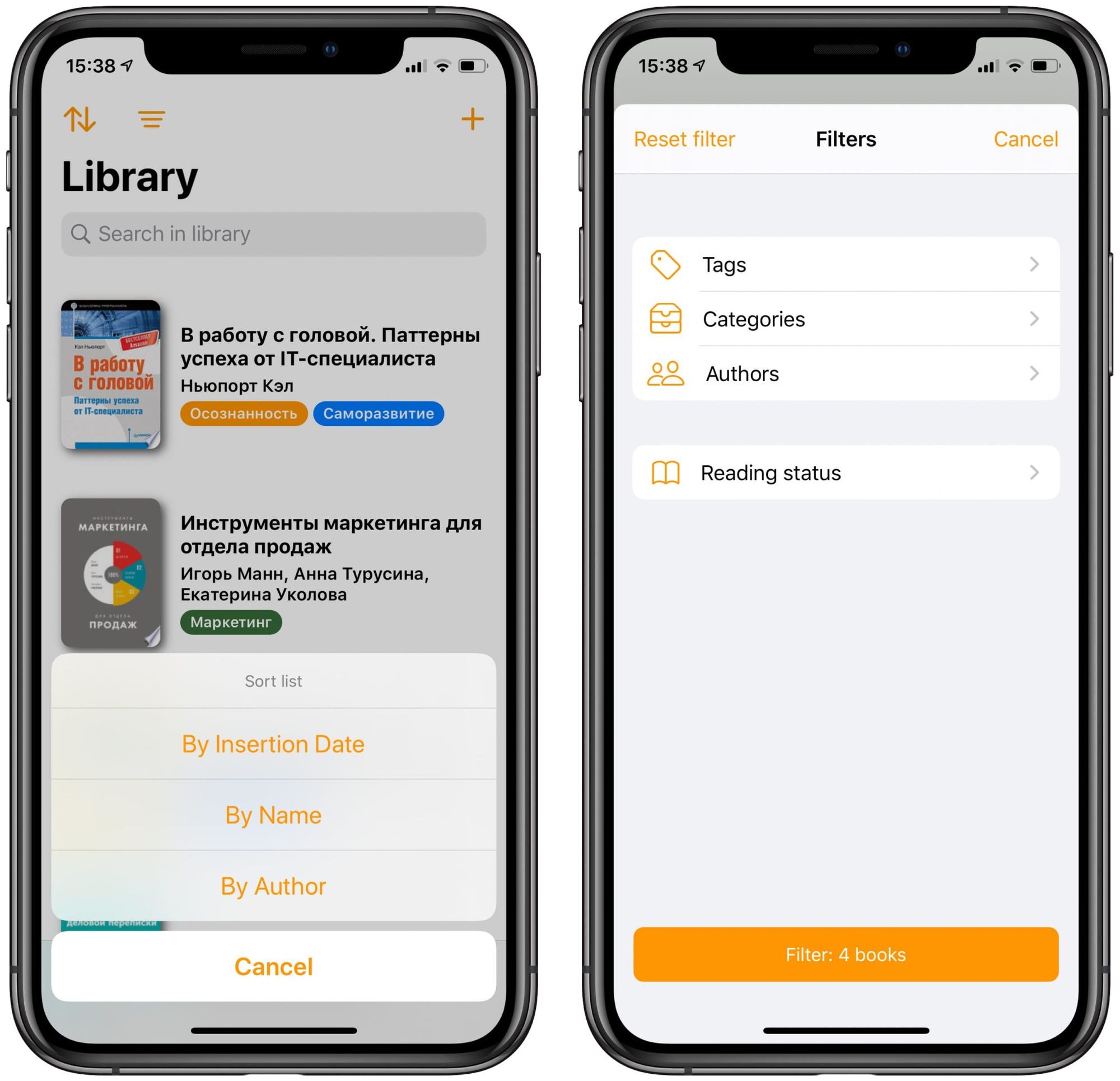 С помощью фильтров можно сделать выборку книг по тем или иным параметрам — автор, жанр, статус (прочитано или нет). Поиск по библиотеке пока возможен по двум критериям — названию и автору. В будущих обновлениях разработчик обещал расширить возможности поиска.