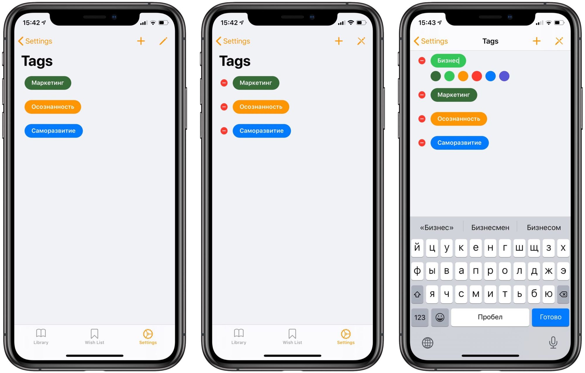 Это можно делать не только при добавлении произведения, но и воспользовавшись меню настроек. При добавлении тегов вы сможете сразу выбирать их цвет. В настройках можно также удалять и изменять теги.