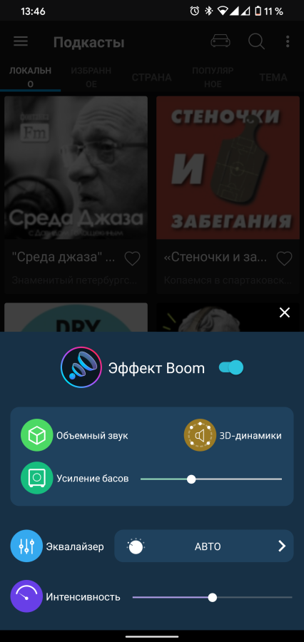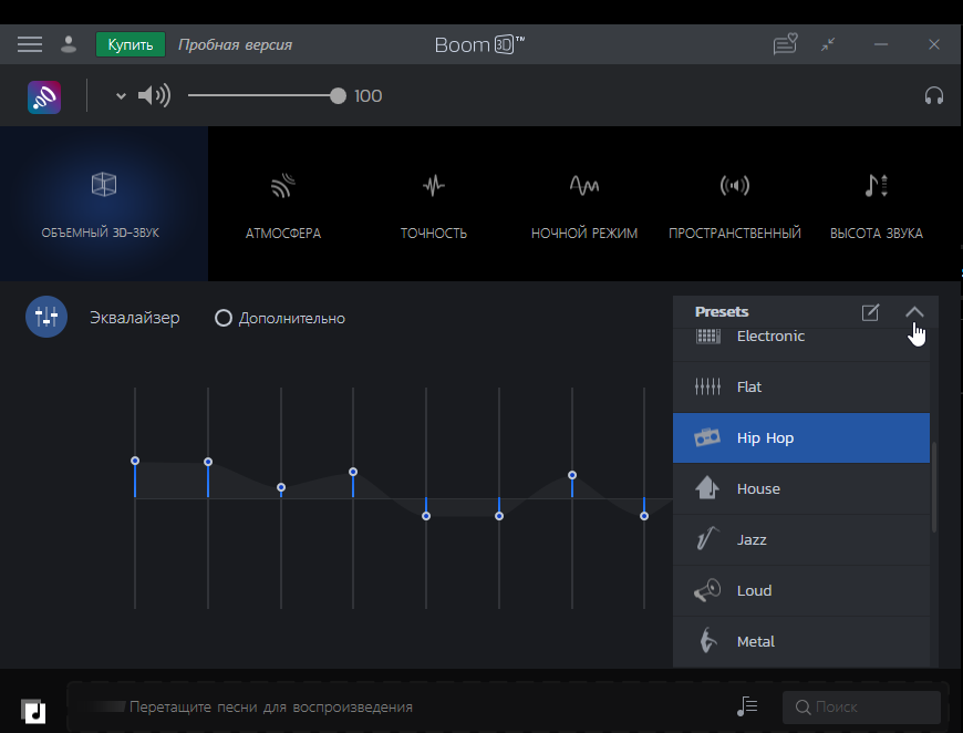 Дополнительно к эффекту 3D можно добавить эффекты погружения, включить ночной режим, усилить низкие частоты и многое другое.
