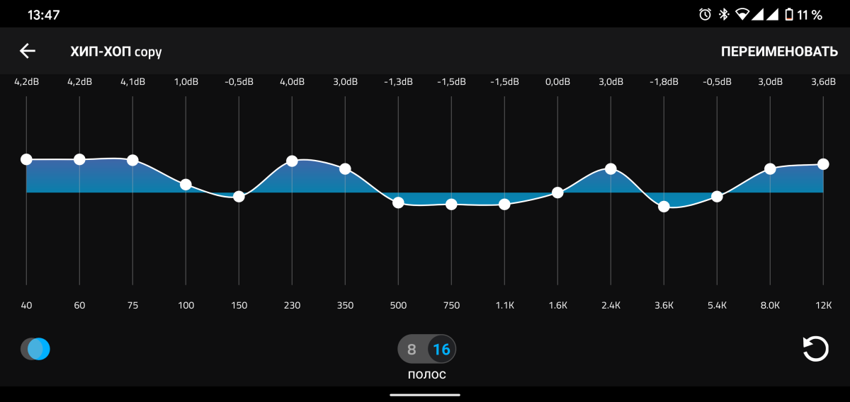 Каких-то особенностей у эквалайзера нет, всё стандартно и понятно. Любые изменения тут же отражаются на звучании в подключённом устройстве.