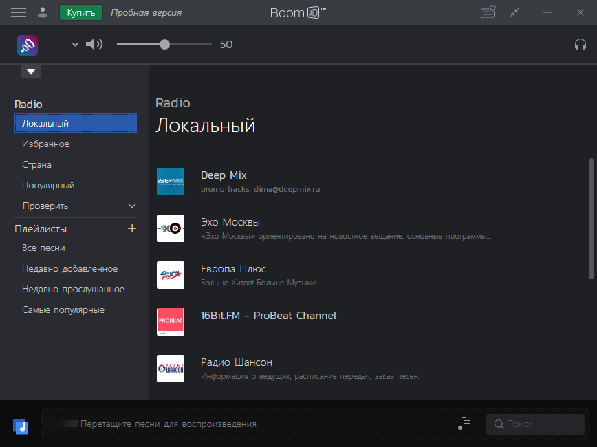 Если развернуть меню на нижней панели, то вы увидите список радиостанций, которые можно слушать прямо из Boom 3D.
