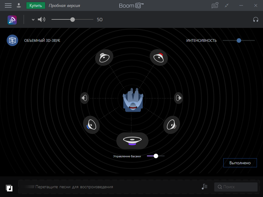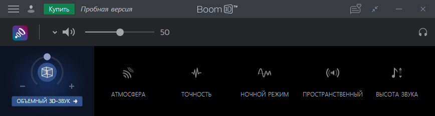 Объёмный звук в Boom 3D, как и все остальные параметры, включается простым кликом по соответствующей иконке на верхней панели.