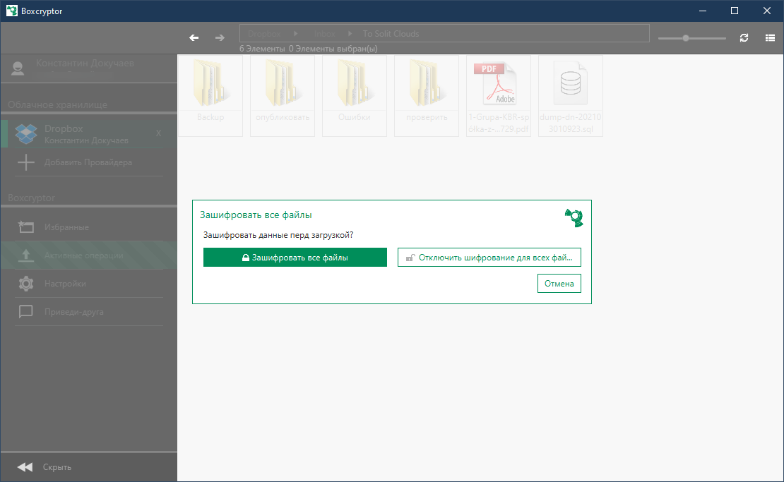 Дальнейшая работа уже ведётся непосредственно в Boxcryptor. Нужно выбрать сервис, перейти в нужную папку и просто перенести в неё файл. После чего будет предложено загрузить данные без шифрования или с шифрованием.