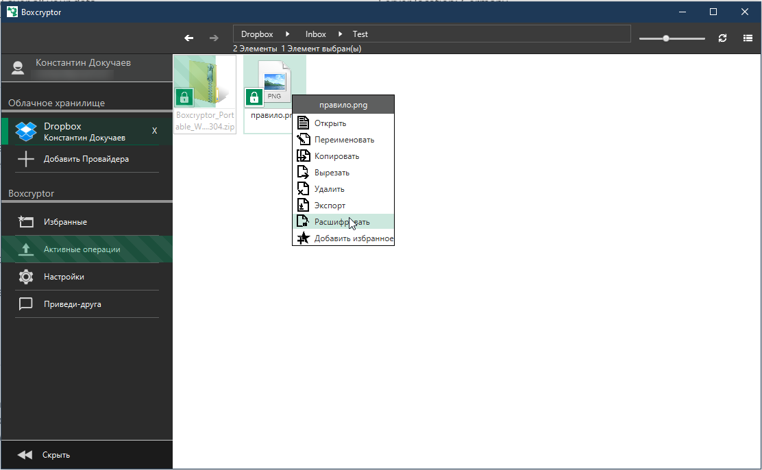 Расшифровать файл можно через контекстное меню Boxcryptor.
