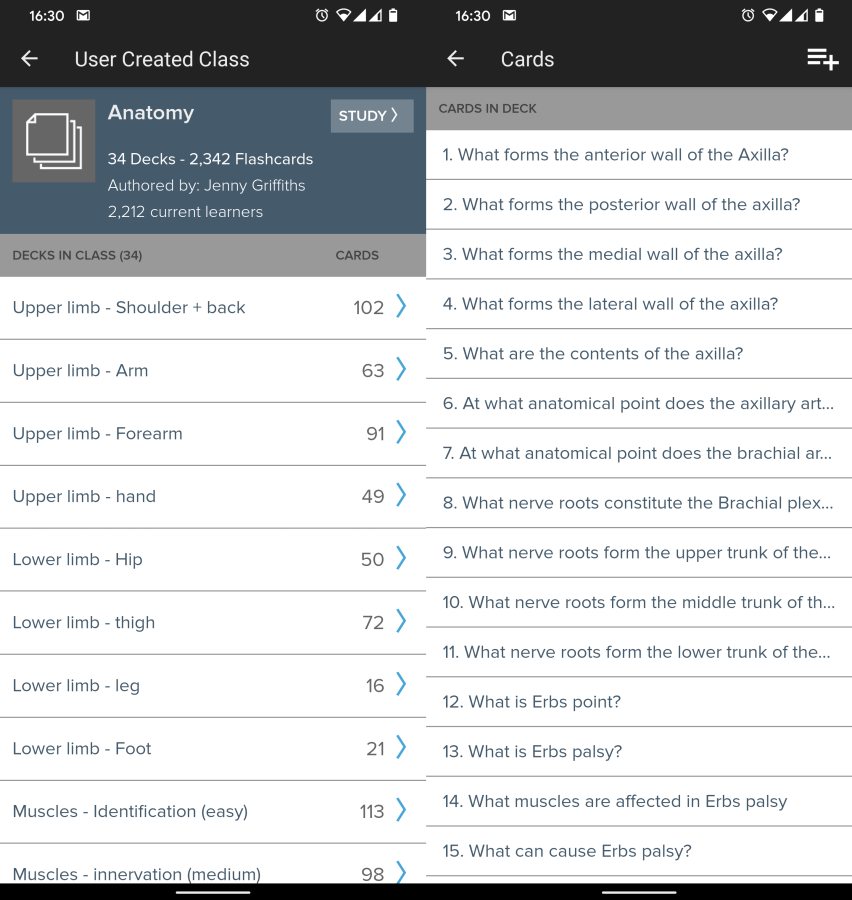 Само обучение происходит так же, как и с физическими флеш-картами. При выборе темы отобразится список карт, которые можно пройти. А сам курс добавляется на главный экран, чтобы вы всегда могли к нему вернуться.