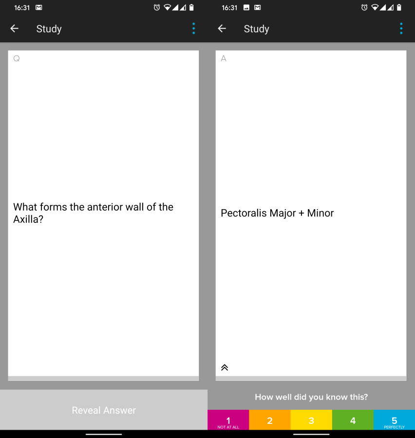 При нажатии на карту открывается вопрос. Чтобы посмотреть ответ, нужно нажать «Reveal Answer». В этот момент нужно поставить оценку, насколько хорошо вы запомнили материал.