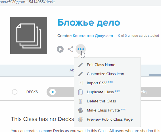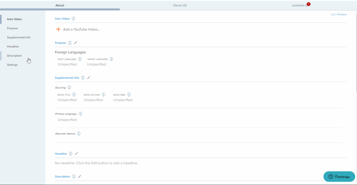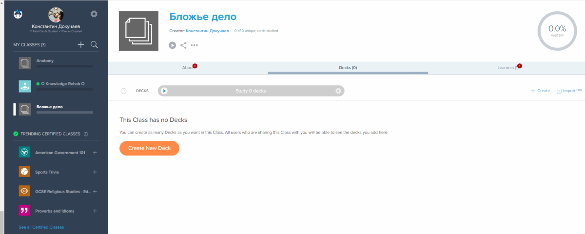 На вкладке «Learners» будут отображаться все ученики, которые решили пройти ваш курс. На вкладке «Decks» создаются деки с карточками. Одна дека — одна тема, в которую нужно добавить карту.