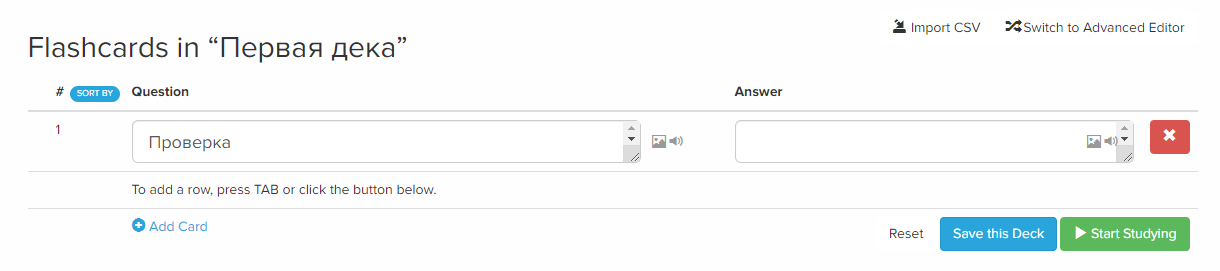 Редактор очень простой. Слева — вопрос, а справа — ответ. Можно добавлять изображения и аудиофайлы.