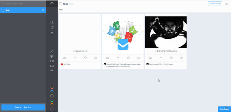 На левой панели сервиса доступна фильтрация по типу содержимого. Есть возможность отобразить ссылки по назначенному им цвету, по тегам, по типу ссылки (картинка, текст, видео) или просто воспользоваться поиском: