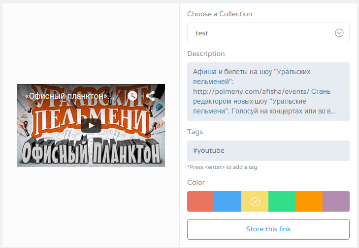 На следующем шаге расширение просит указать название коллекции для ссылки. Так же есть возможность добавить описание, теги и цвет. После чего ссылка добавляется в выбранную коллекцию.
