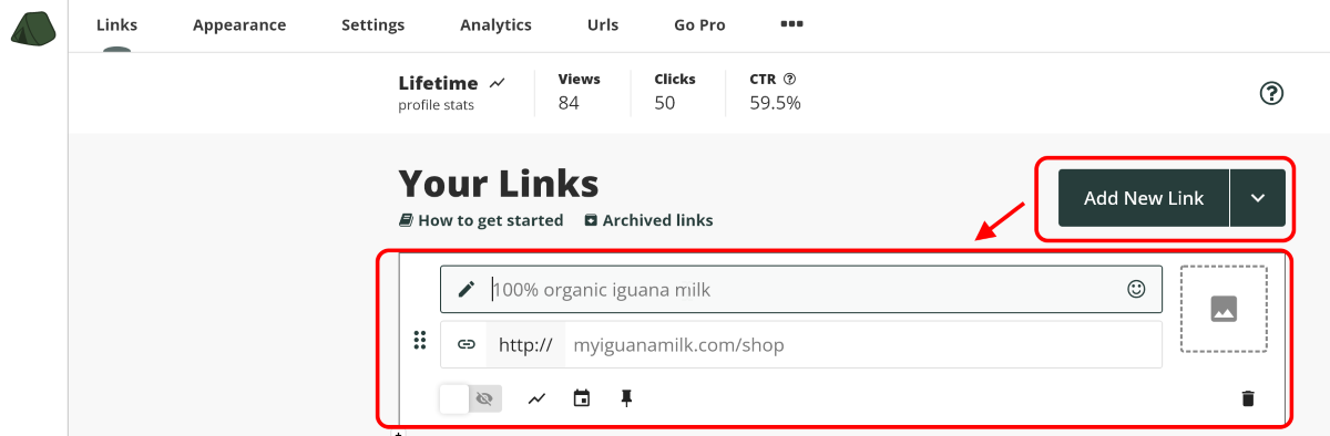 Чтобы создать свою страницу на Campsite, как и на аналогичных сервисах, достаточно после авторизации в админке нажать кнопку Add New Link.