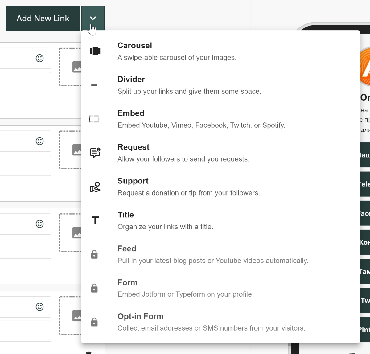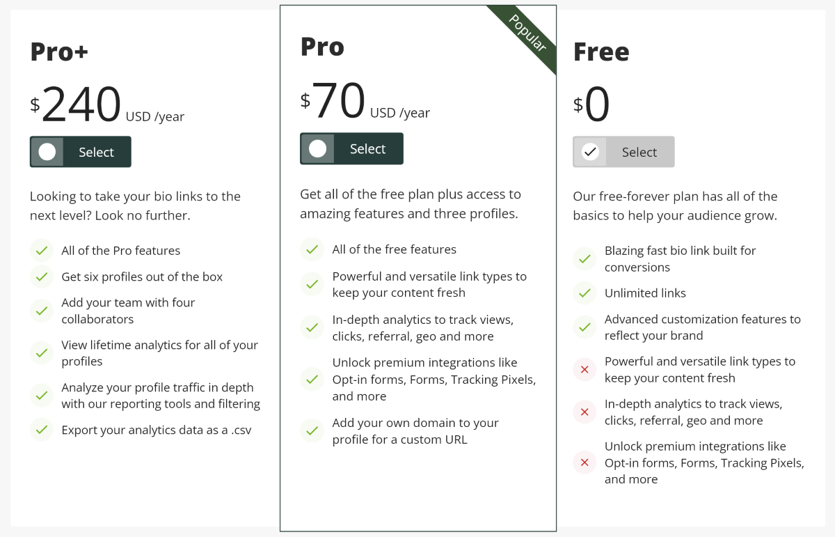 Сервисом можно пользоваться бесплатно. В этом случае вы не сможете добавлять некоторые типы ссылок, не получите доступ к полной аналитике, а также не сможете пользоваться пикселями отслеживания и прочими маркетинговыми штуками.