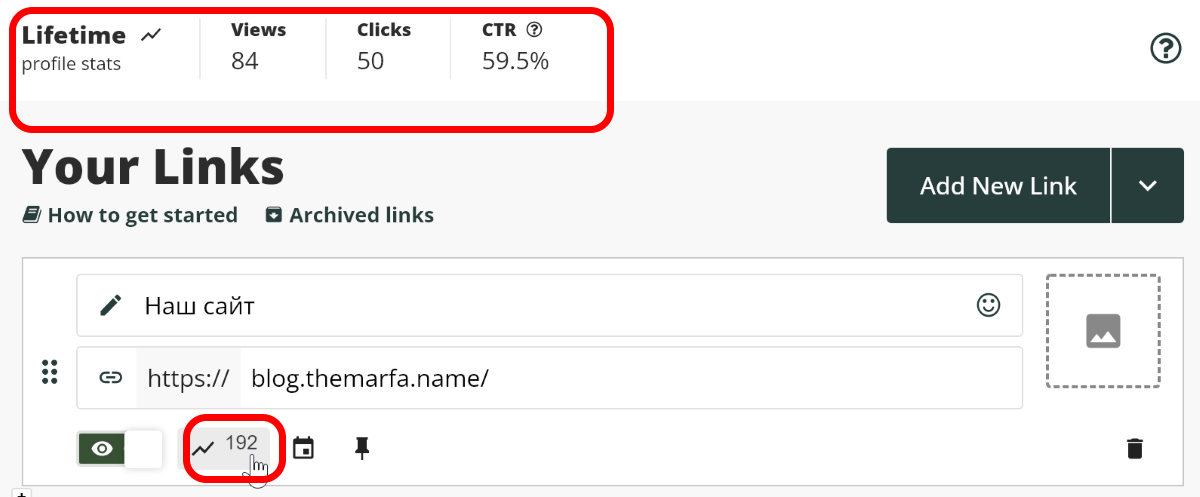 Также у каждой ссылки есть статистика по переходам. Как и самой страницы, где можно увидеть общее количество просмотров, переходов и CTR.