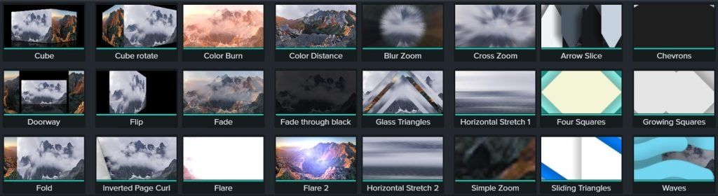 В каждой новой версии Camtasia появляется всё больше различных переходов. Сейчас их уже более ста в восьми категориях: