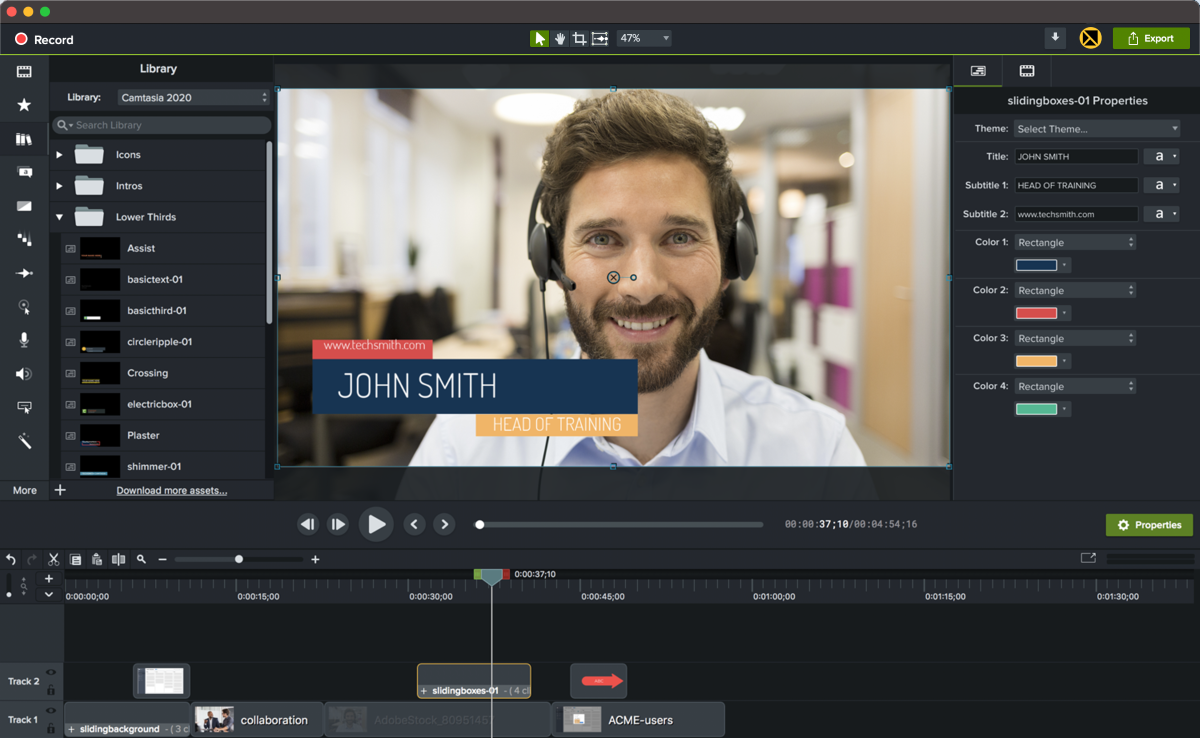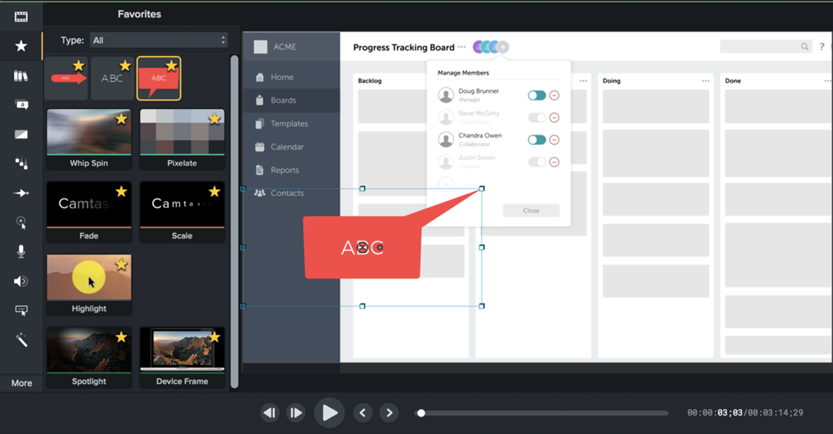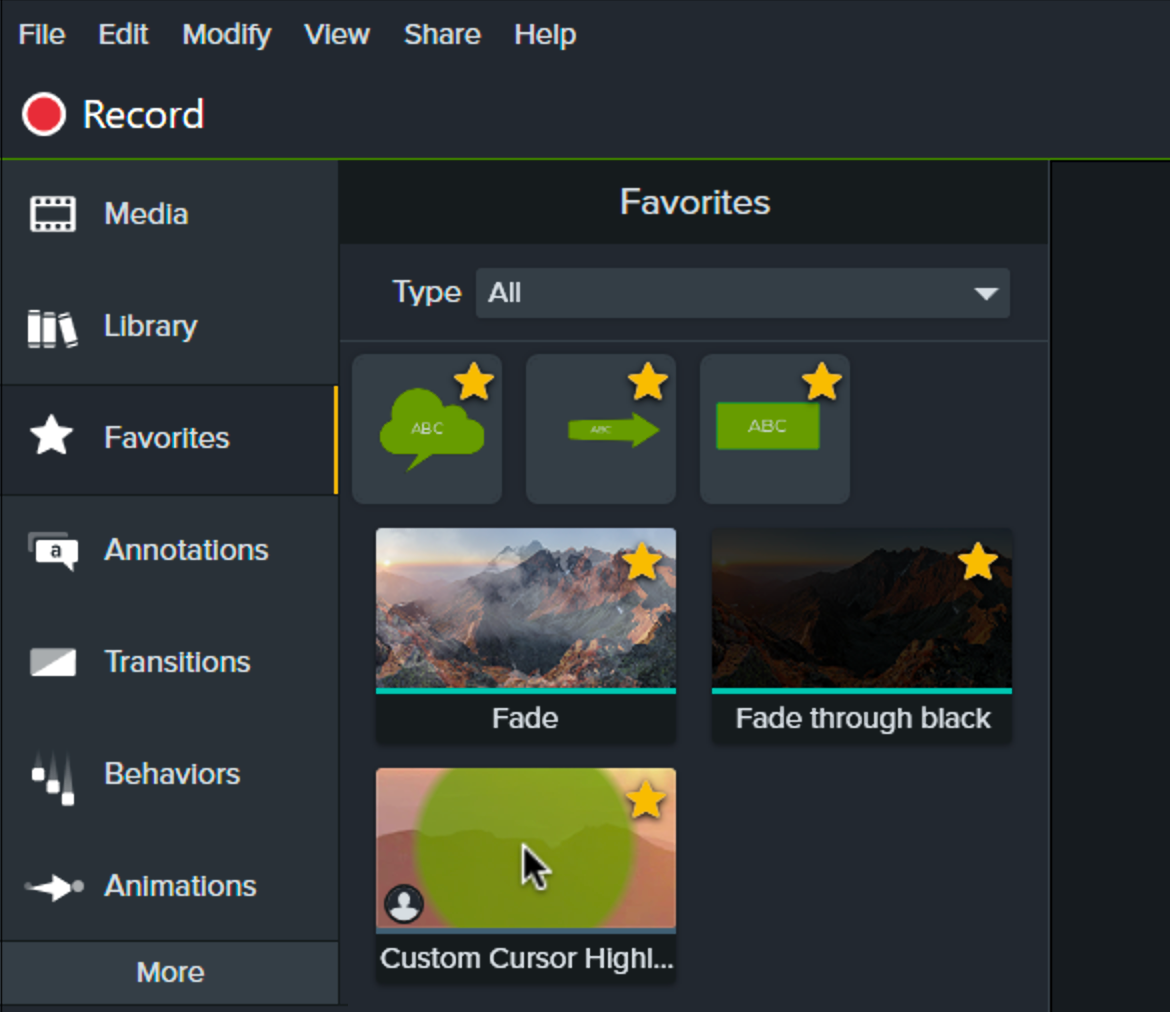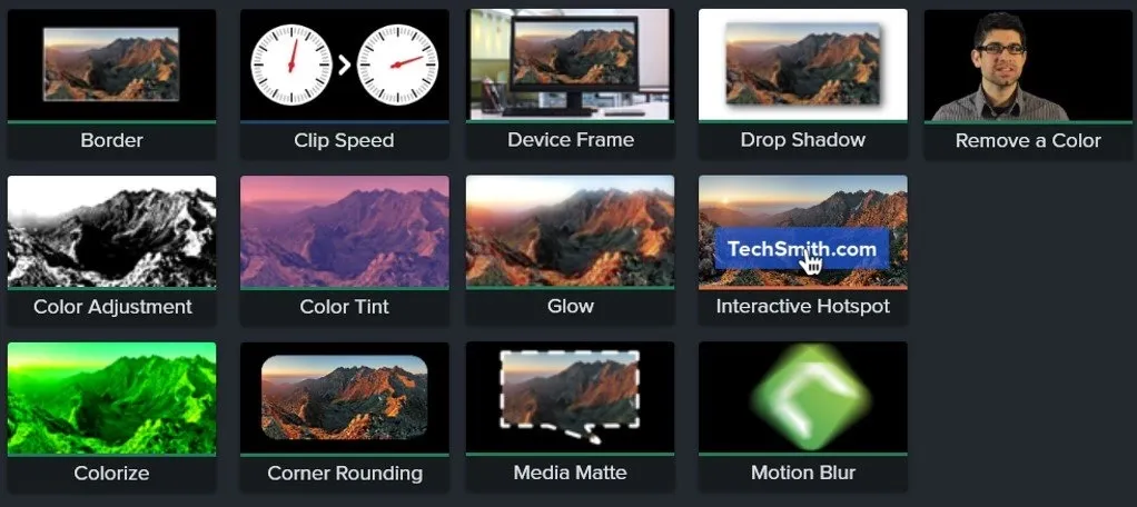 В Camtasia есть множество различных видео, аудио и текстовых эффектов, которые можно быстро добавить в проект: