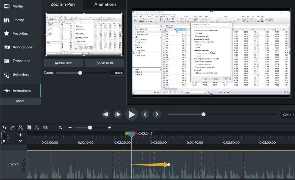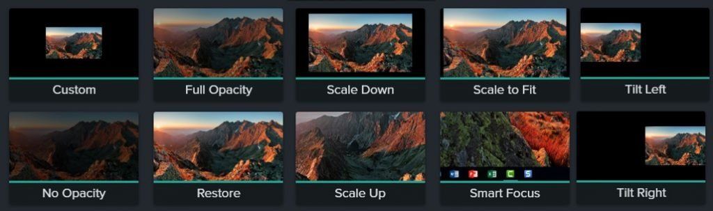 Добавить эти эффекты очень просто. Для этого на превью клипа достаточно изменить размер зоны камеры, и Camtasia автоматически выберет подходящую для этого анимацию.