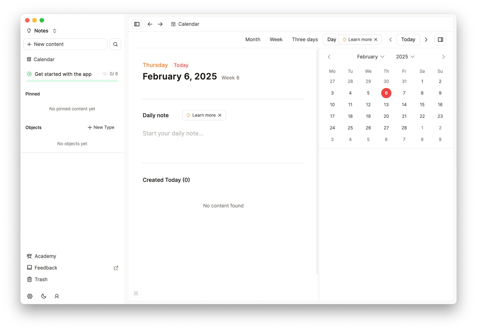 Здесь всё почти так же, как и в Notion. У вас есть две панели: одна для навигации по заметкам, а другая — само содержимое заметки. В зависимости от типа заметки может появиться и третья панель, например календарь.