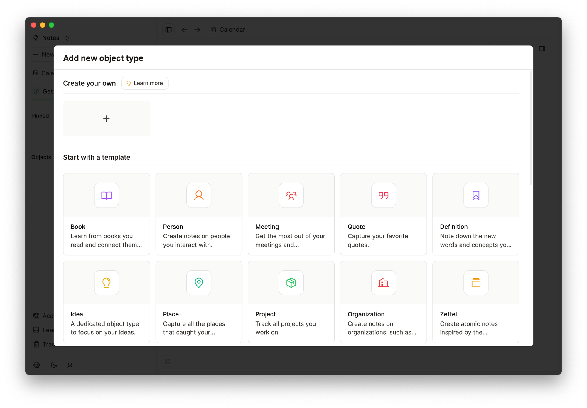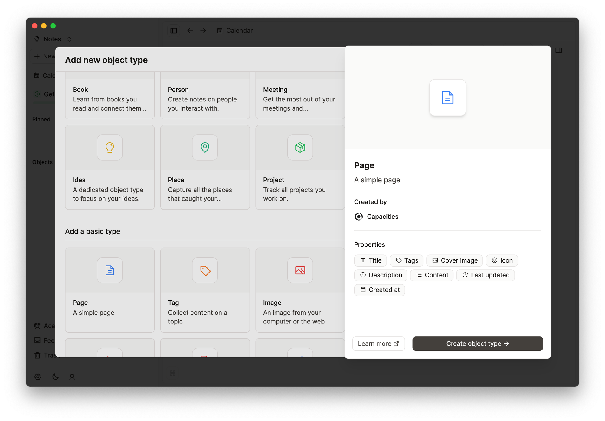 В Capacities вся информация хранится в Объектах (Objects). Их можно создавать на основе шаблонов: книга, человек, встреча и прочее. Или по типу: страница, тег, изображение. Конечно, можно создать пустой объект и наполнить его необходимыми типами.