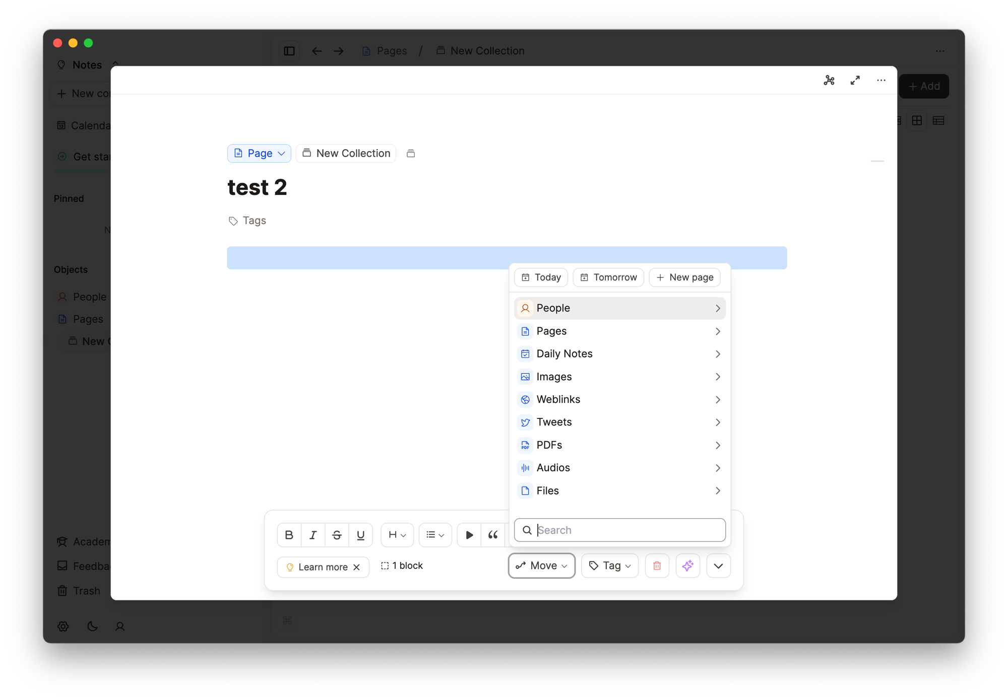Готовые заметки можно линковать друг с другом, добавлять теги, перемещать между коллекциями и изменять их тип.