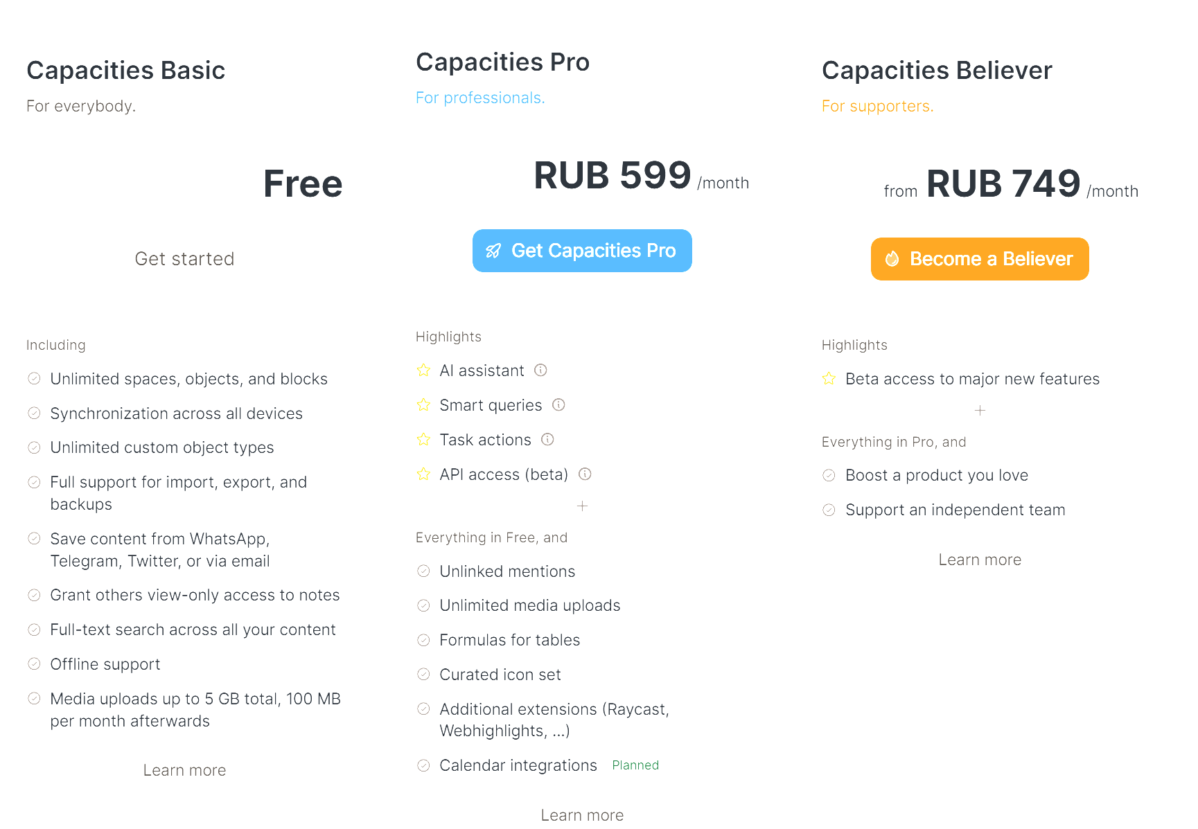 Прежде чем нырять в платную версию Capacities, я рекомендую месяц другой посидеть на бесплатной версии. На сайте разработчики обещают множество фишек, но часть из них находится ещё в разработке и недоступны для пользователей. Поэтому стоит убедиться, что вы не заплатите за сервис зря.