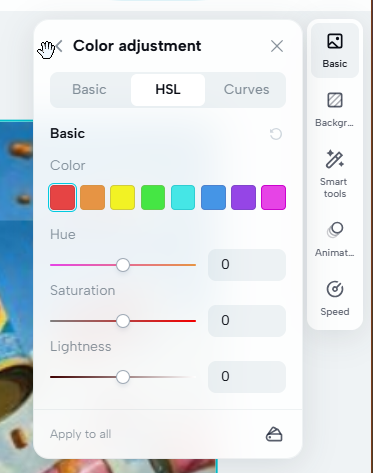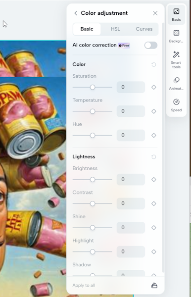 А вот инструмент цветовой коррекции вышел на славу. В нём есть три варианта коррекции: базовый, HSL и Кривые. Как ни странно, ИИ-коррекция доступна именно в базовом варианте. Здесь же можно поправить сам цвет, яркость и прочие параметры. Про HSL и кривые, думаю, и так всё понятно.