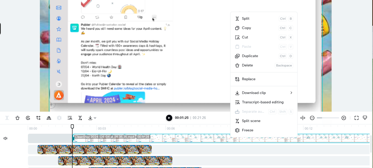 В зависимости от типа дорожки, через контекстное меню будут доступны различные действия. Можно обрезать, разделять, кропать, поворачивать содержимое. Изменять скорость из таймлайна нельзя, но можно это сделать прямо из редактора слоя.