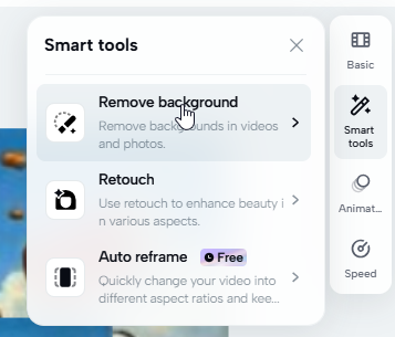 В инструменте Smart Tools доступна быстрая базовая обработка с помощью нейронок. У фото и видео можно убрать фон, произвести быструю ретушь лица. Для видео дополнительно можно активировать автоматическую постановку кадра в зависимости от объектов на сцене.