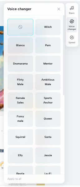 Вместо Smart Tools для аудиодорожек доступно изменение голоса. Вы можете выбрать один из эффектов и применить его к вашей записи.