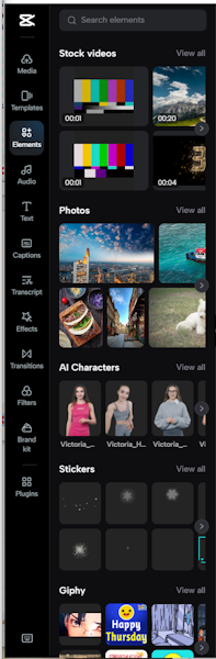 В разделе Elements к проекту можно добавить различные стоковые элементы: видео, фото, ИИ-персонажи, стикеры и многое другое.