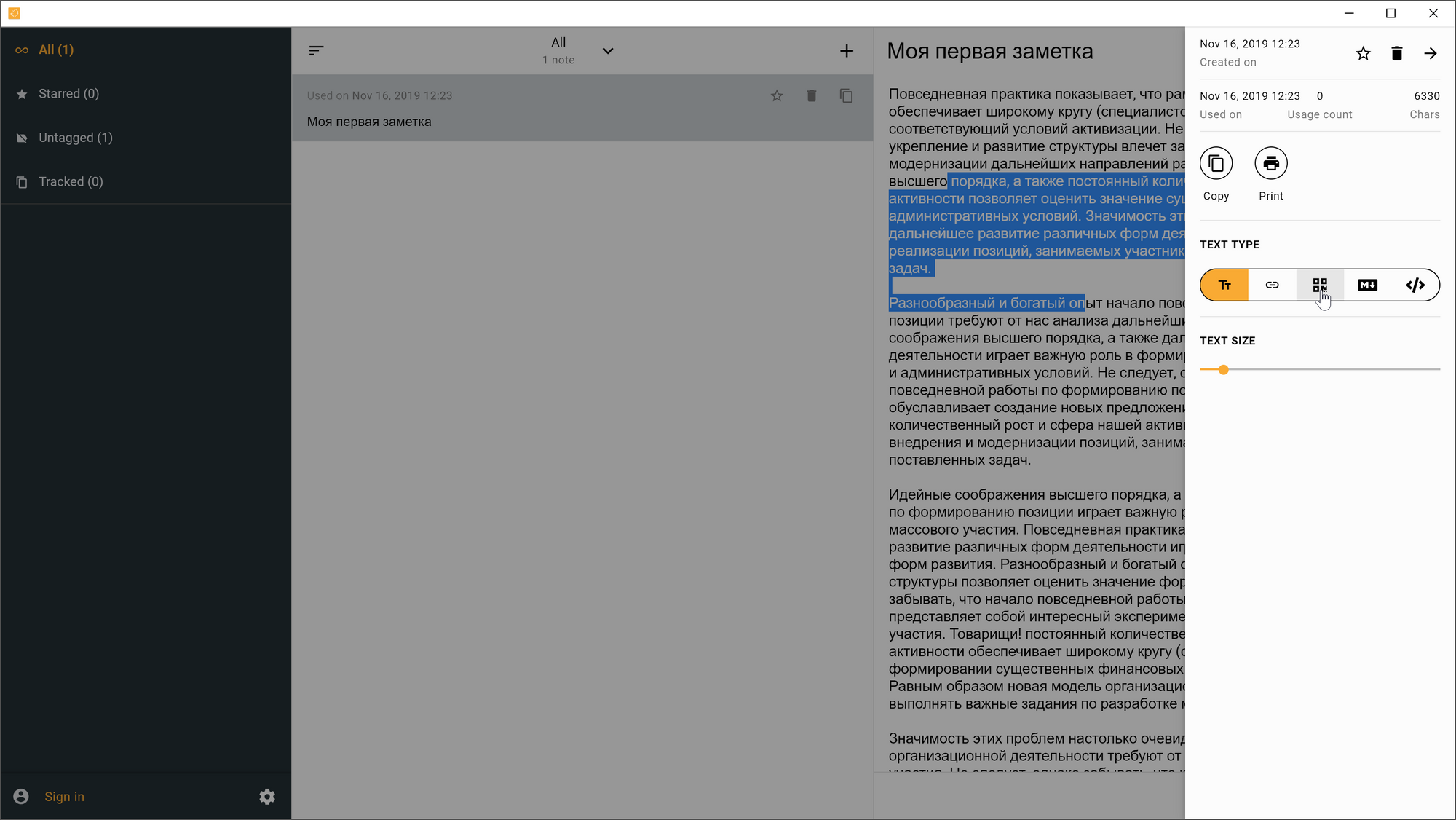 К сожалению, внутри заметки есть проблемы с форматированием текста. Сам текст хранится в обычном виде без поддержки форматирования. На специальной панели можно применить один из форматов сразу ко всей заметке.