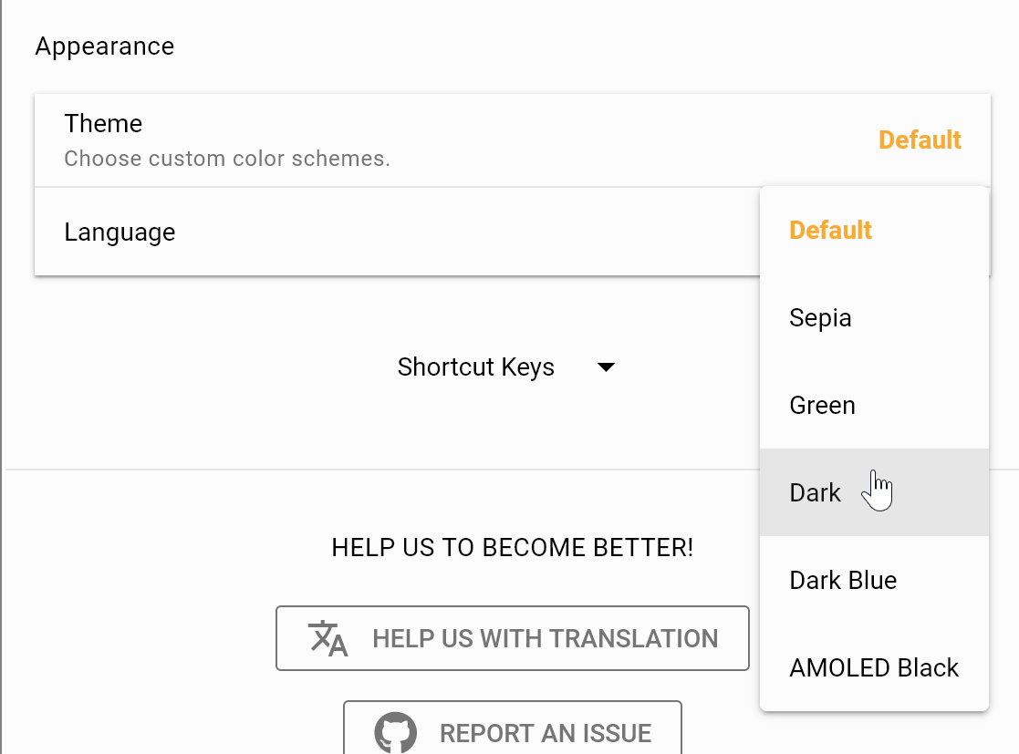 В Windows-версии всего шесть тем, без возможности тонкой настройки. В Android-версии уже семь тем с возможностью выбора шрифтов.