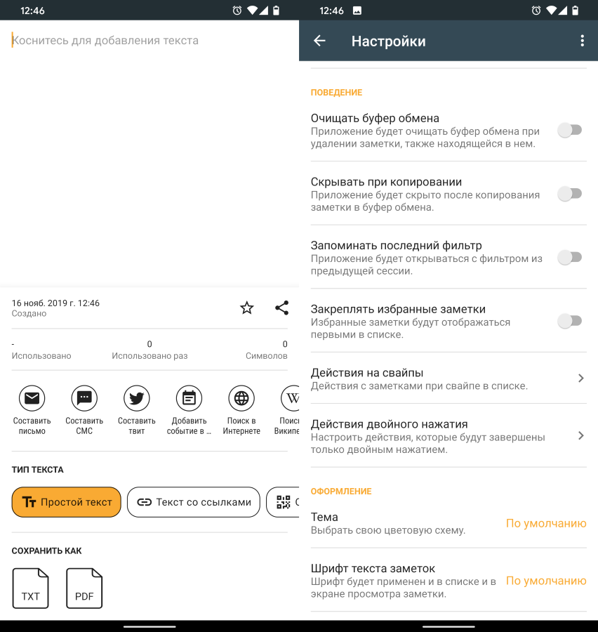 Кроме большего числа настроек самой программы, вы также можете совершать и больше действий с заметками. Искать текст в интернете, добавлять в календарь события, экспортировать в PDF и пересылать в письме или по СМС.