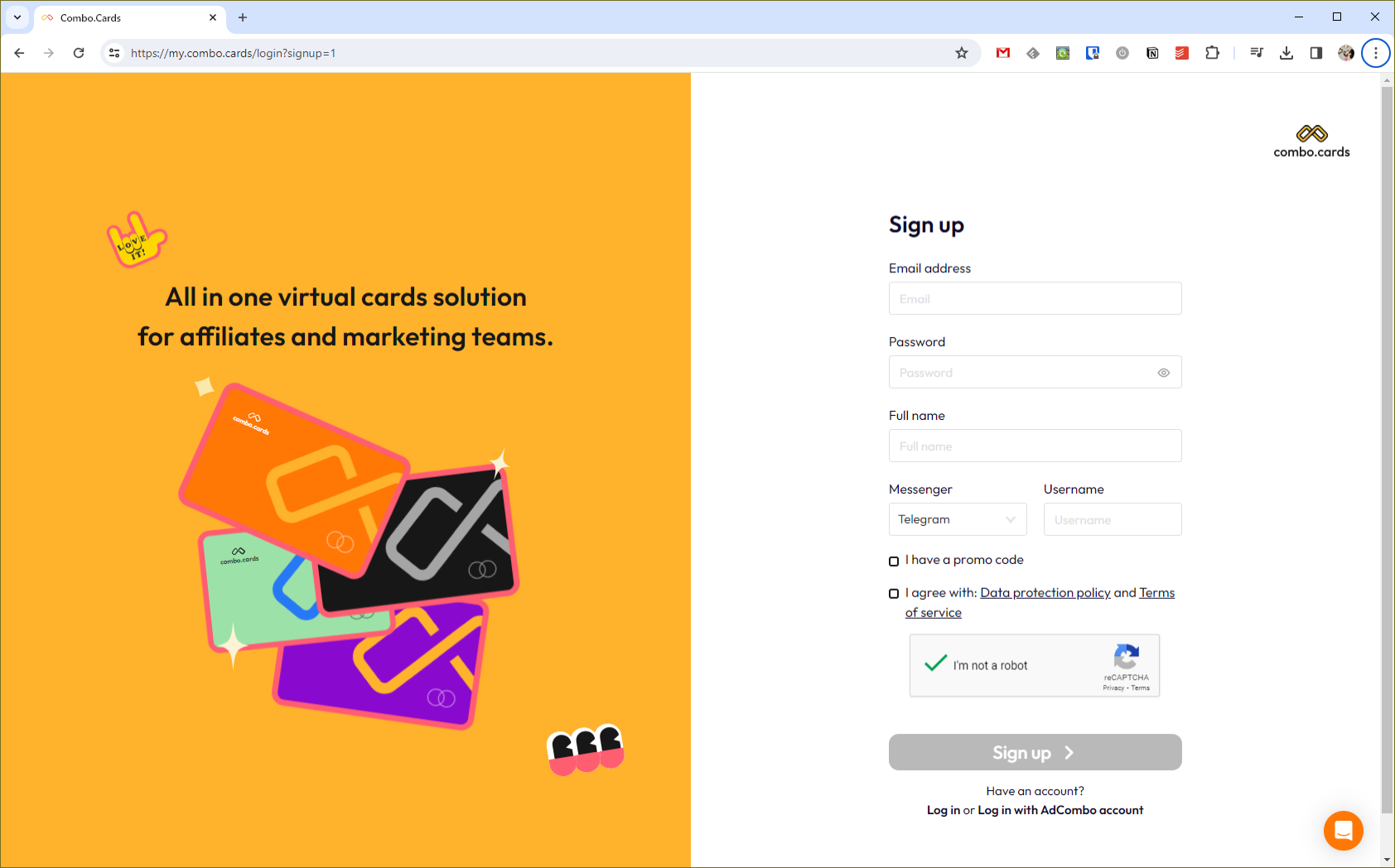 Процесс регистрации в Combo Cards максимально простой. От вас требуется только почта, юзернейм в Telegram или Skype, и вы уже можете начинать работу в сервисе.