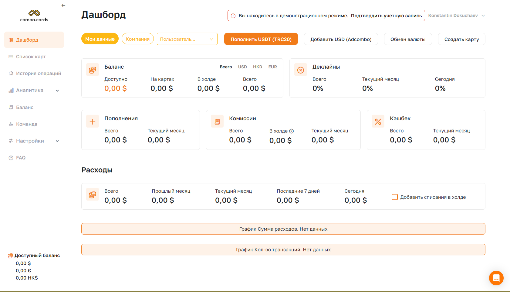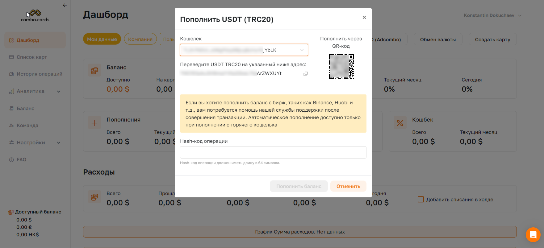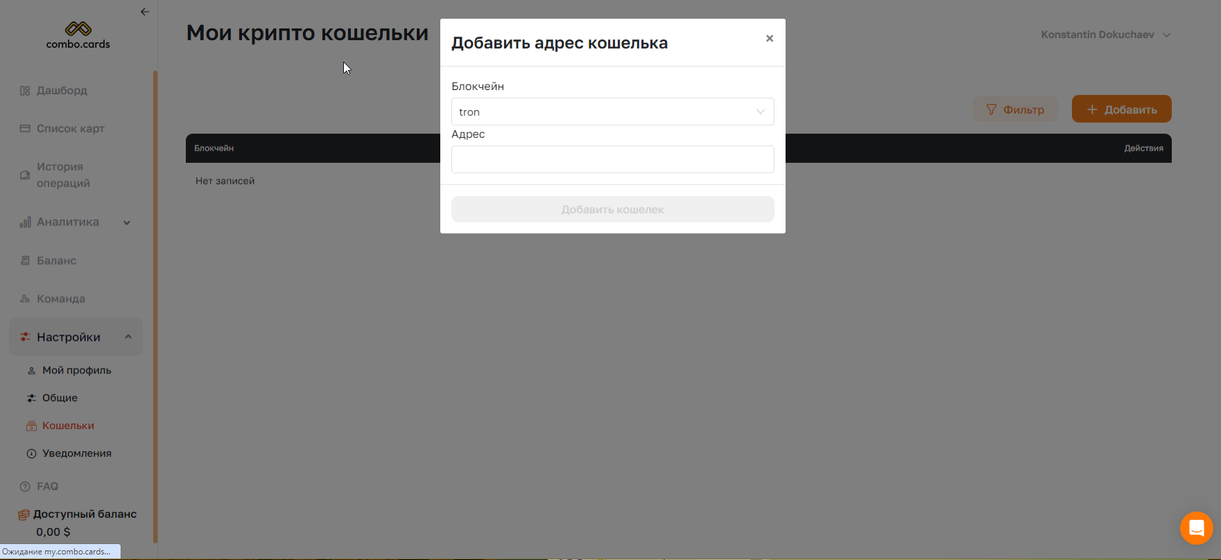 Баланс можно пополнить только со страницы Дашборда, даже без прохождения KYC. Чтобы сделать это, в систему нужно добавить Кошелёк, с которого вы будете пополнять баланс. Он добавляется через раздел Настройки, либо Combo Cards автоматически перекинет вас на нужную страницу при первой попытке пополнения баланса. Здесь потребуется добавить кошелёк в сети TRC-20.