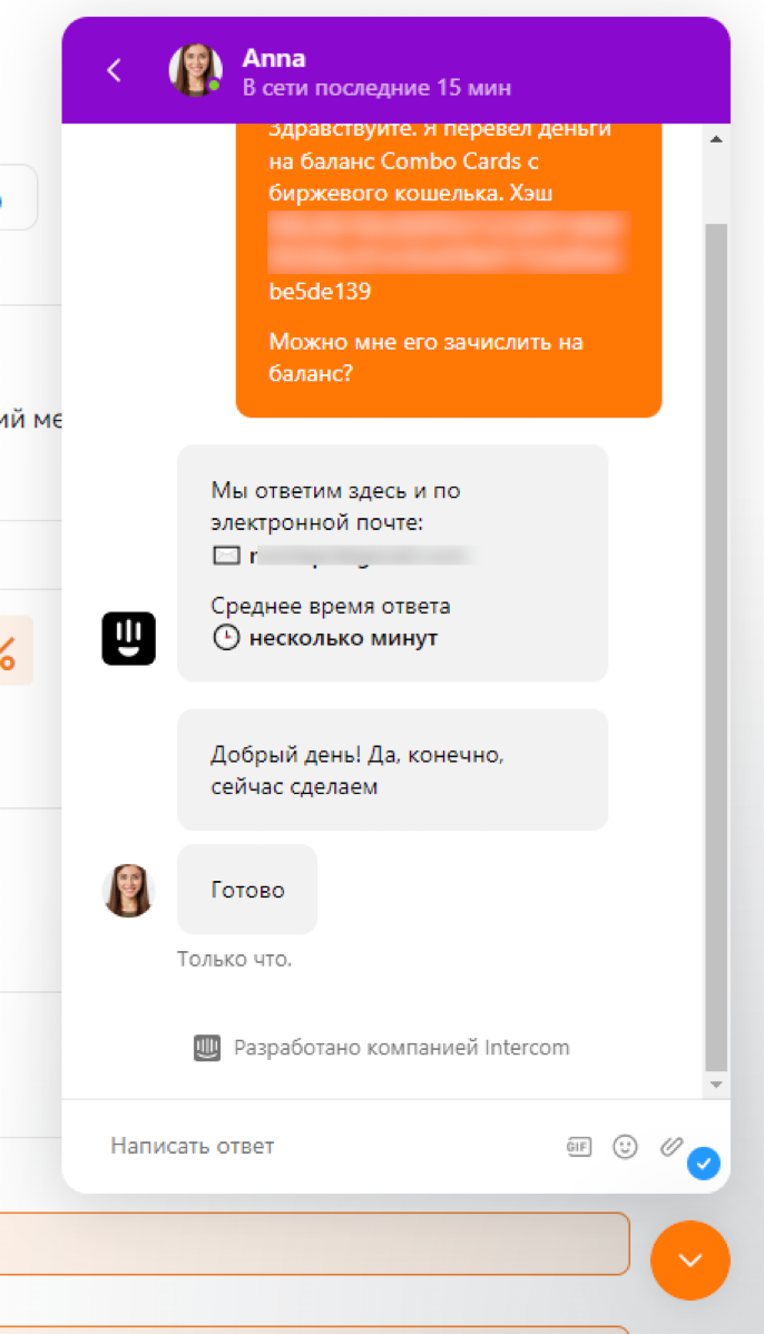 После этого при дальнейшем пополнении баланса вам нужно будет выбрать ваш кошелёк в системе, и именно с него пополнить личный кабинет переводом на номер кошелька Combo Cards. Сумма пополнения может быть любая, но потребуется указать hash-операции.