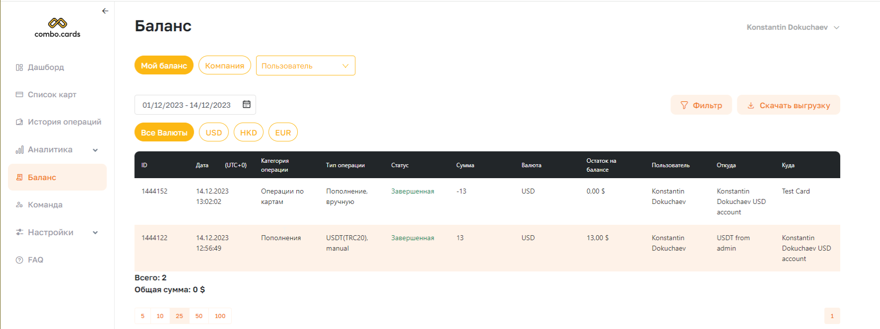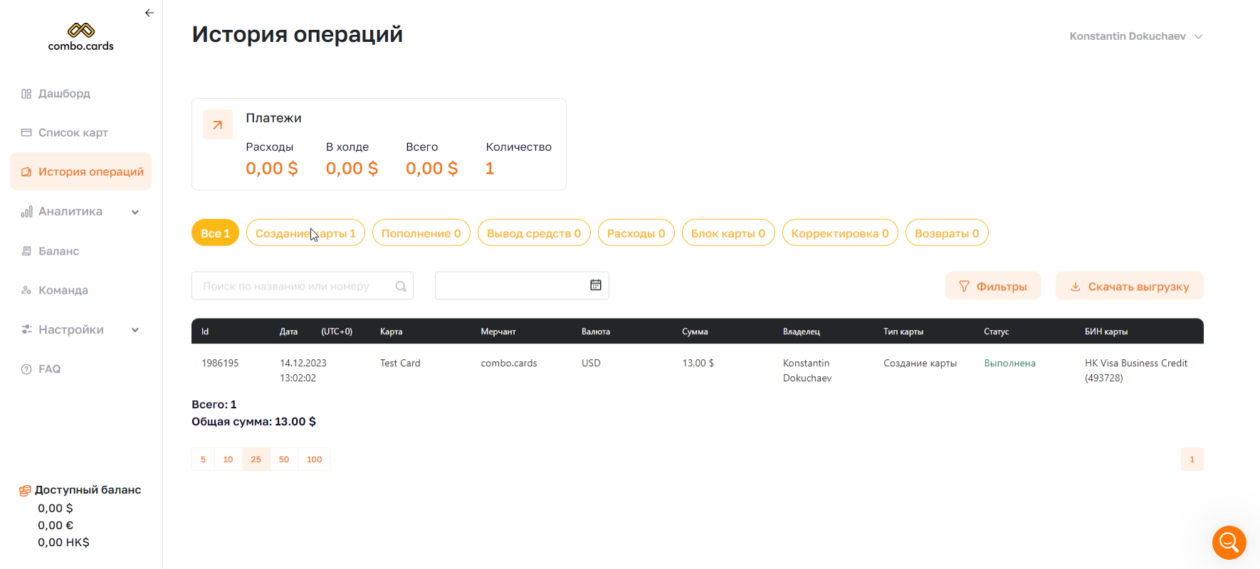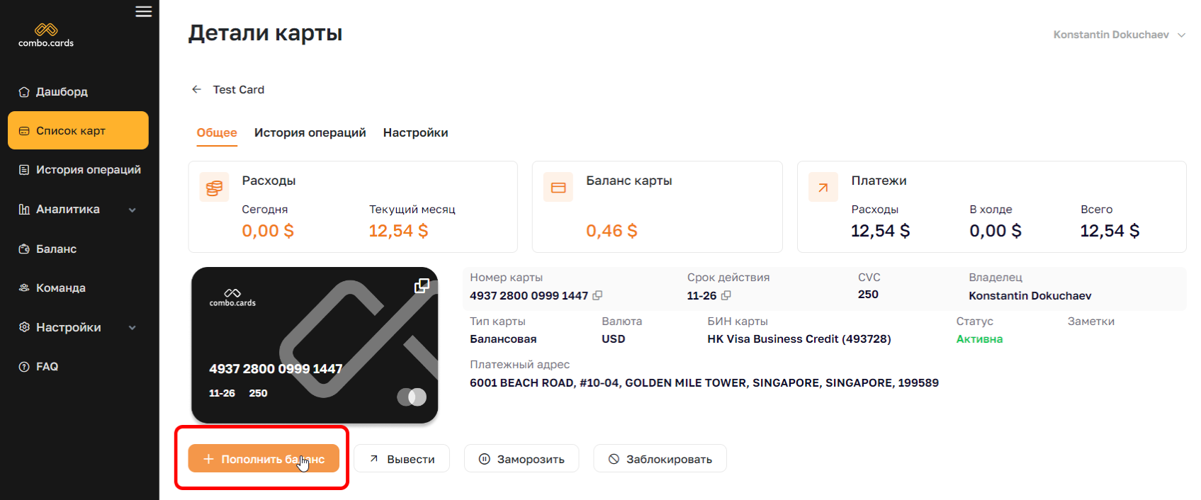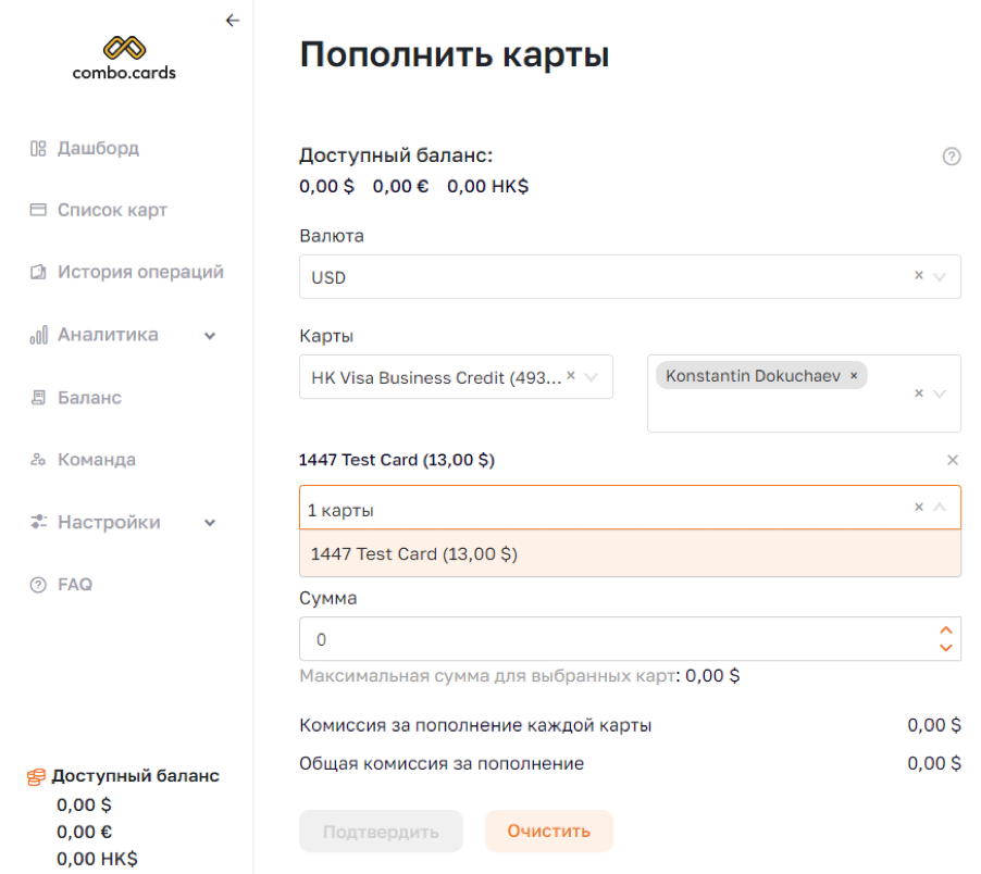 Есть возможность отфильтровать отчёт по себе, компании или конкретному пользователю. Отсюда же можно пополнить баланс, конвертнуть валюту или создать карту.