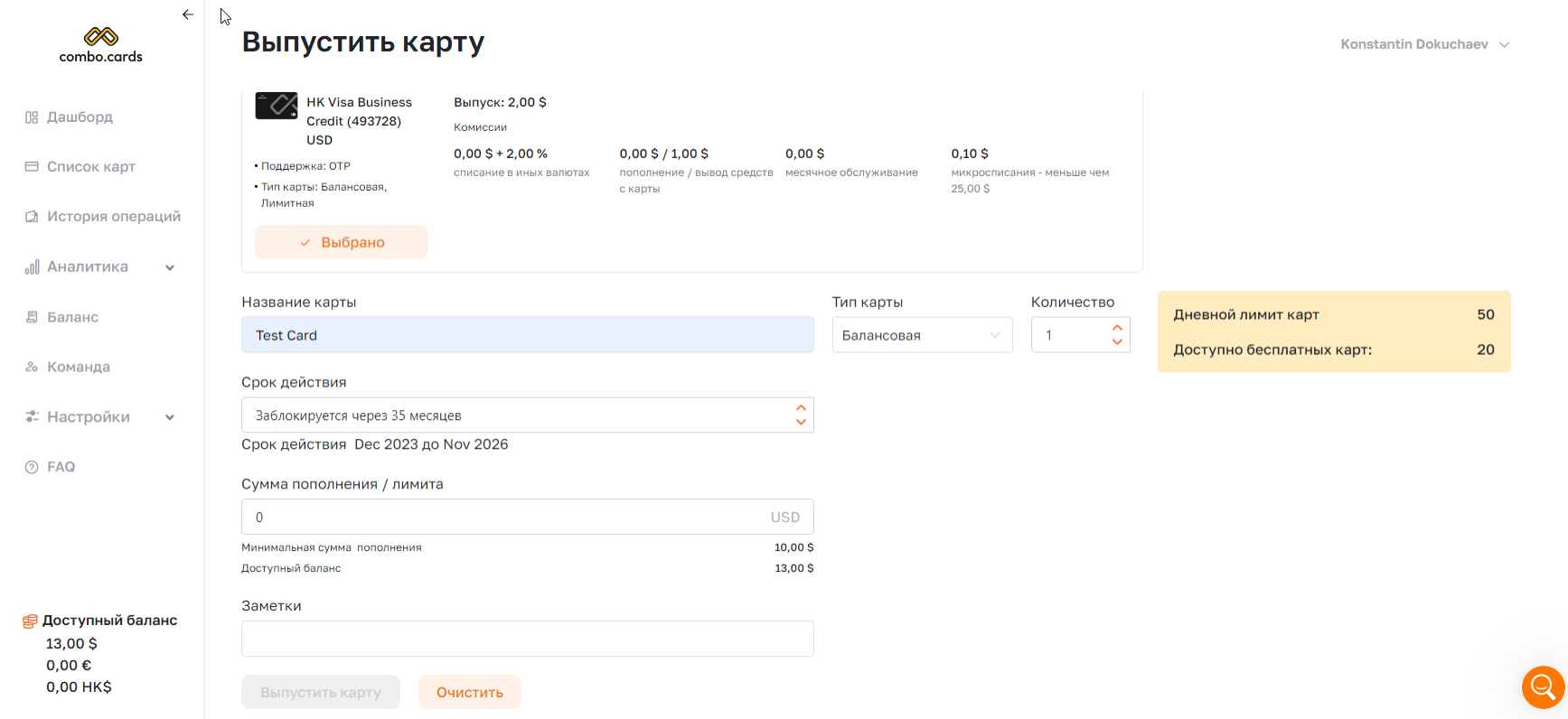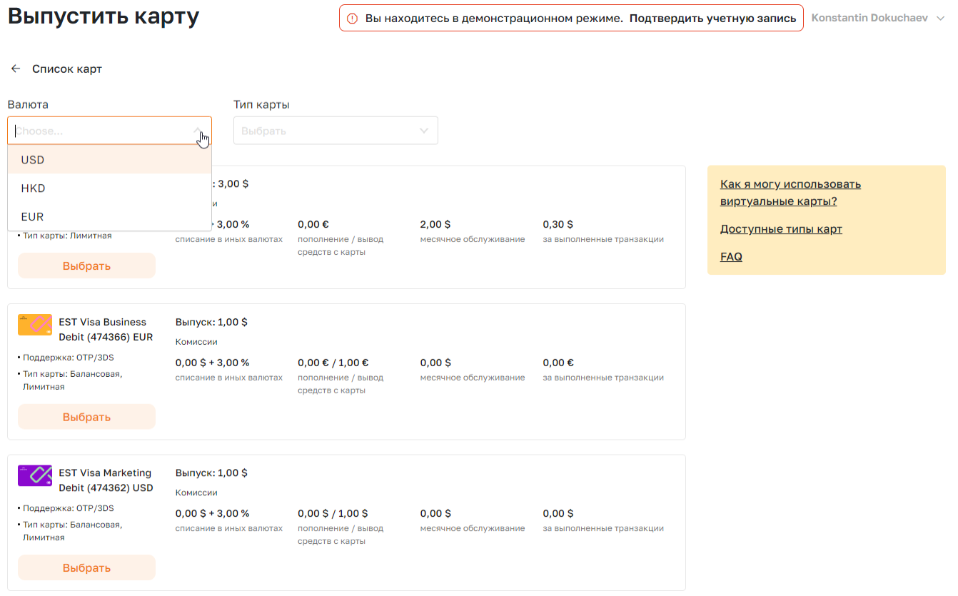 Но и в деморежиме вы сможете пополнять баланс и даже выпускать карты с некоторыми ограничениями.