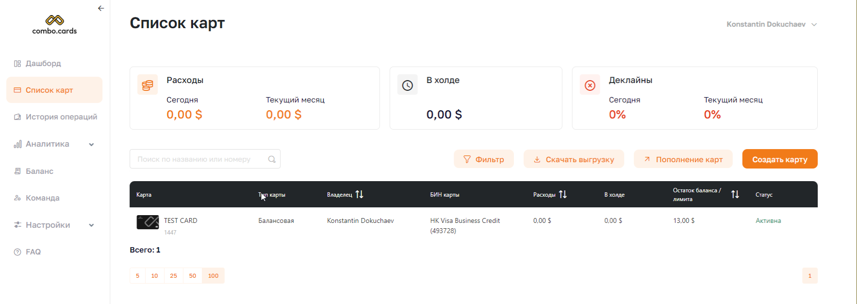 После заполнения всех необходимых полей карта выпускается в течение минуты, и просмотреть данные по ней можно в разделе Список карт. Здесь можно увидеть все расходы по картам за день и месяц, суммы в холде и процент деклайнов.