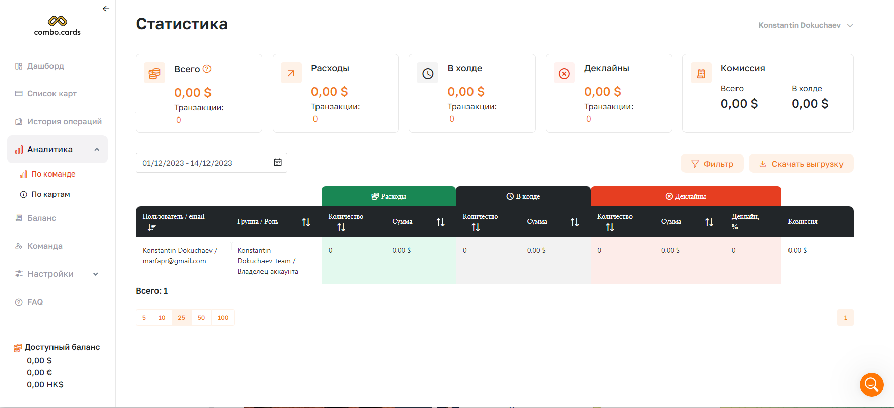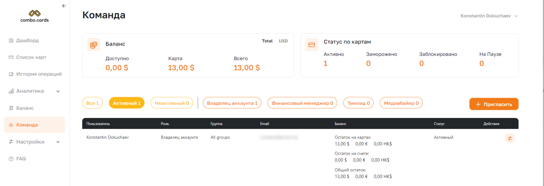 Как и в любом крупном сервисе для арбитража, в Combo Cards доступна командная работа. На общем дашборде можно быстро узнать статус всех выпущенных карт и доступный баланс в системе и на картах. Аналогичная информация есть и по каждому пользователю внутри вашей команды.