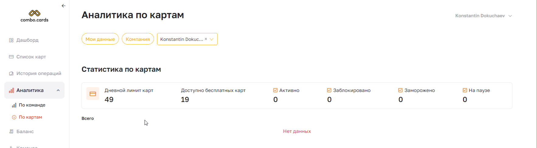 Аналитика по картам выглядит чуть проще. Вы можете узнать, сколько осталось доступных карт и текущее состояние уже выпущенных карт. Есть возможность просмотра информации по компании или конкретному пользователю.