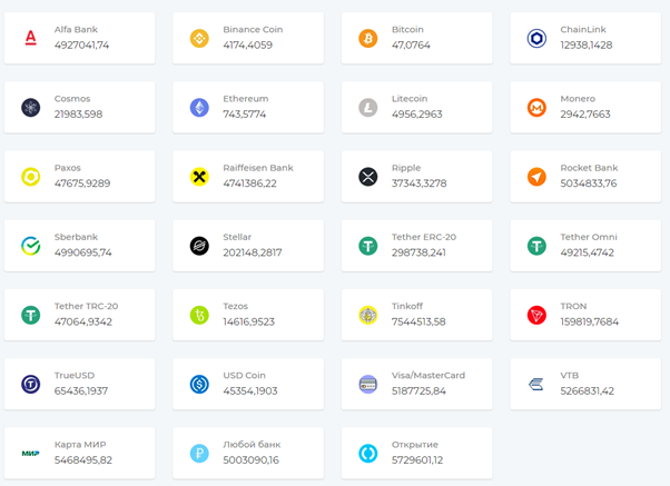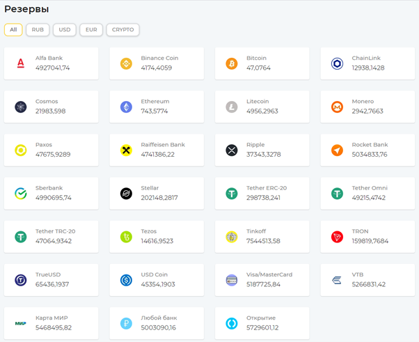 Выше я уже писал, что на главной странице отображается резерв по всем доступным валютам. Здесь же, соответственно, можно понять, какие деньги можно менять между собой.