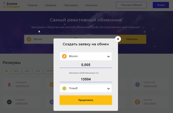 CosmoChanger — русскоязычный сервис для обмена криптовалюты со скоростью обработки заявок до 10 минут.