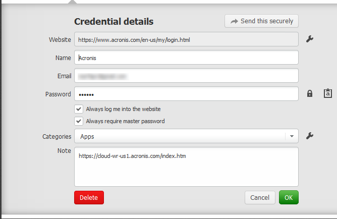 Заметками, так же как и паролями, можно безопасно поделиться. Нужно лишь нажать Send This Securely и указать адрес почты. Адресату придет письмо со ссылкой на ваш пароль. После просмотра ссылка будет уничтожена. В лучших традициях жанра.