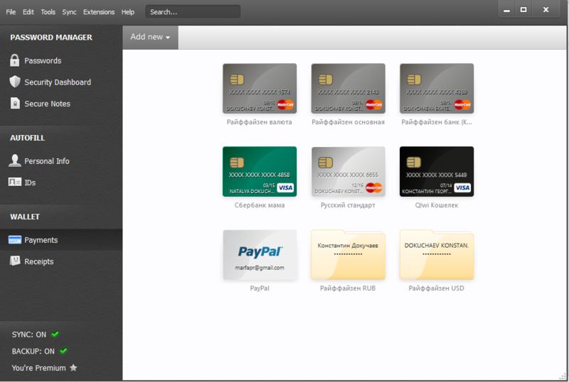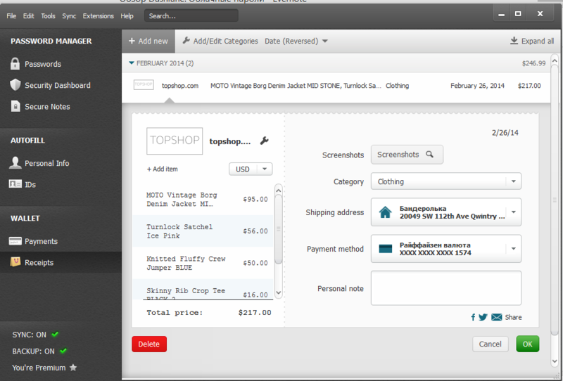 Здесь вы можете указать данные своих банковских карт и Dashlane поможет вам заполнить все необходимые данные при покупке в интернет магазине, а счет автоматически сохранится в разделе Receipts. Для карт можно задать адрес доставки по умолчанию.