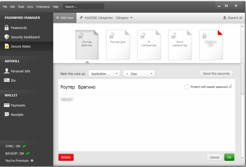 В программе есть раздел Заметок. Здесь предполагается хранение таких вещей, как пароли от приложений, Wi-Fi, секретных вопросов, и вообще всего, что нельзя сохранить в разделе паролей. Заметки могут быть защищены паролем основной программы.