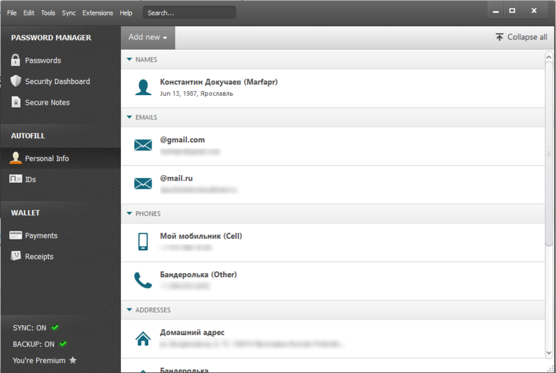 Здесь вы можете сохранить личную информацию. Свои имена (на русском и английском) с указанием параметров для регистрации на сайтах. Адреса, которые будут использоваться при заполнении полей для доставки товара. Почта и мобильники. Всю эту информацию Dashlane сможет автоматически подставлять в соответствующие поля при необходимости, что значительно упрощает процедуру регистрации или покупки товара.