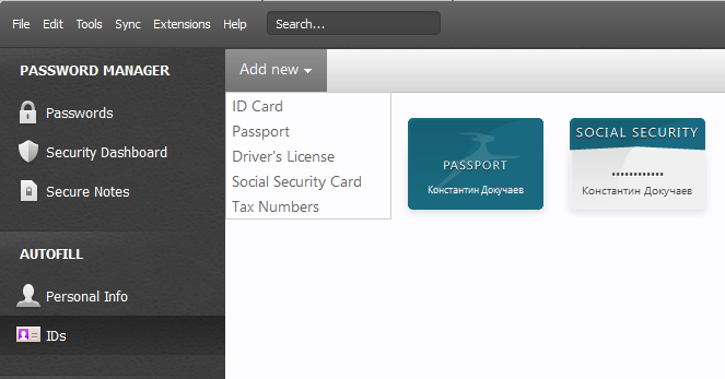 В разделе IDs можно хранить данные паспортов, СНИЛС и пр. Что самое приятное, программа напомнит, когда истечет срок документа.