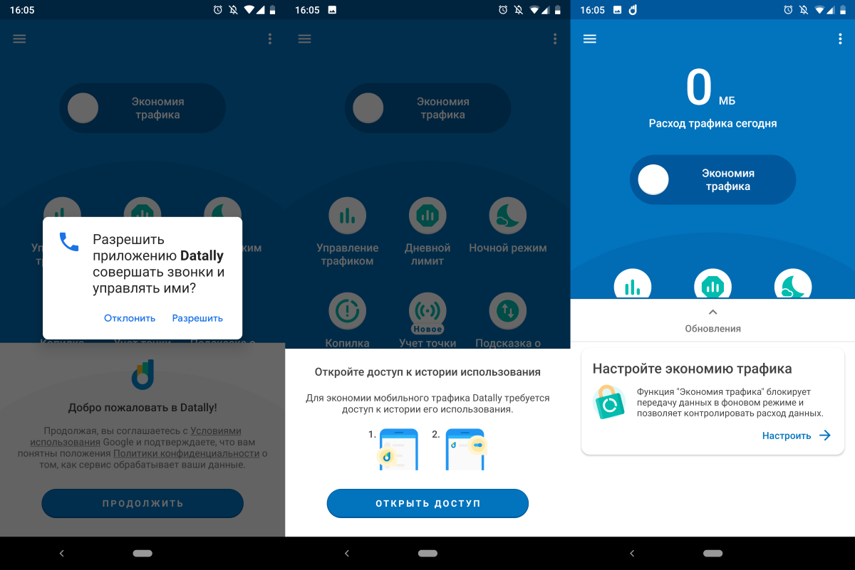 При первом запуске Datally немного ошеломляет пользователя запросами. Для работы приложения нужно разрешить управление звонками, чтобы оно могло понимать, когда вы пользуетесь Wi-Fi, а когда мобильной сетью.